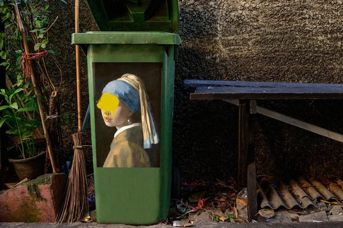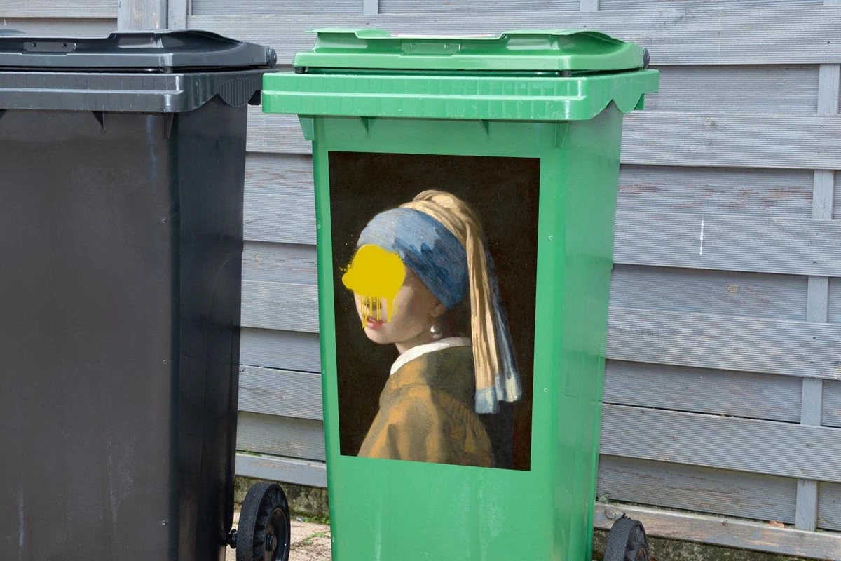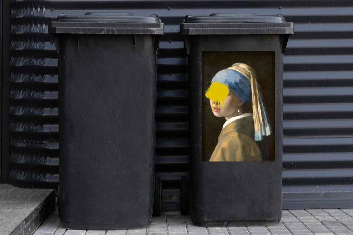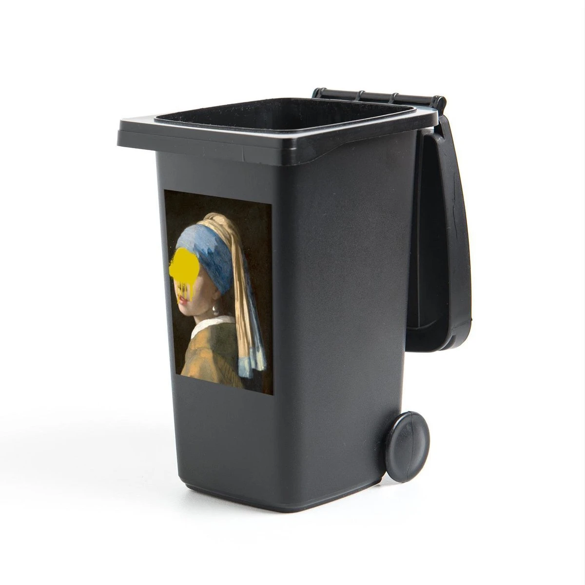 Autocollant De Conteneur Vieux MaîtresIllustrations De Noël – Fille Avec Une Boucle D’oreille En Perle Par Le Vieux Maître Johannes Vermeer Avec Une Goutte De Peinture Jaune