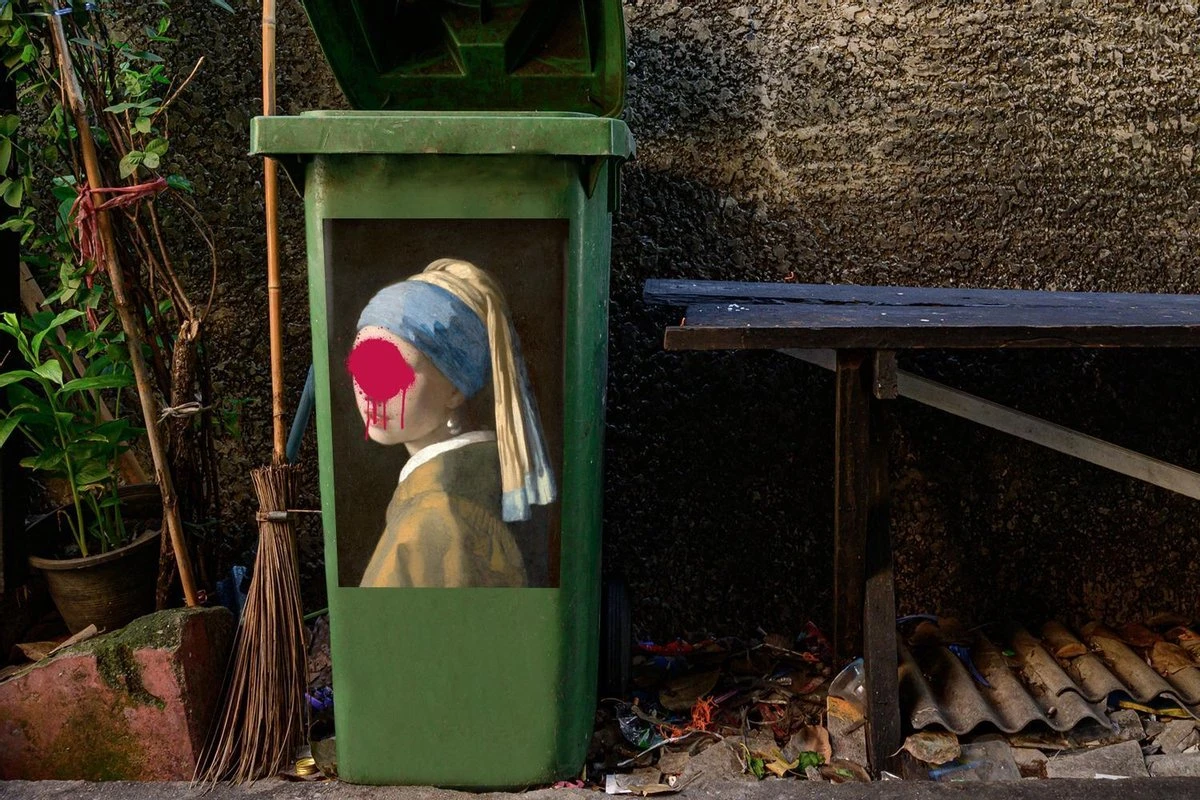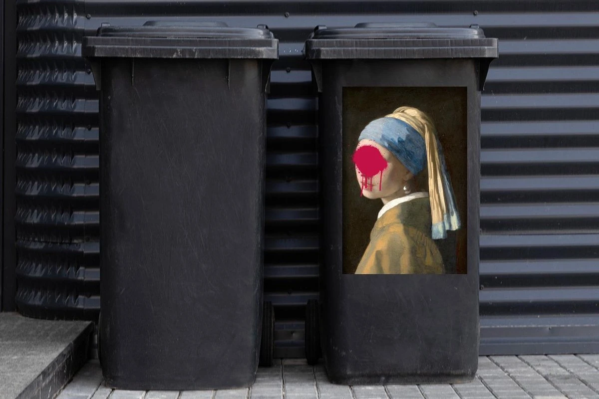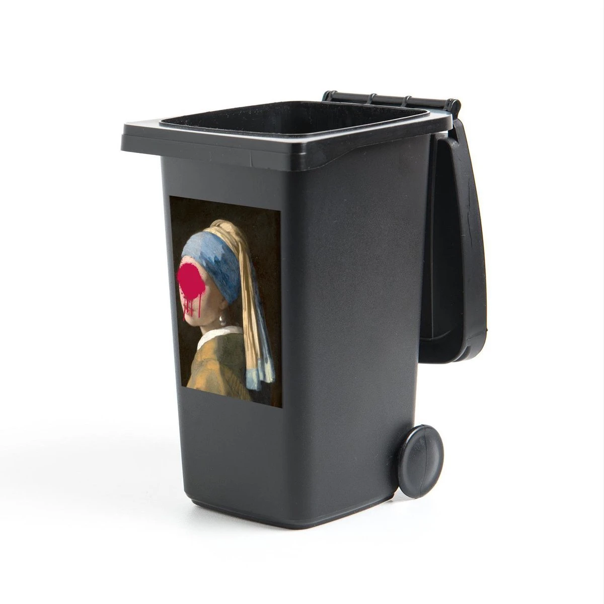 Autocollant De Conteneur Vieux MaîtresIllustrations De Noël – Fille Avec Une Boucle D’oreille En Perle Par Le Vieux Maître Johannes Vermeer Avec Une Goutte De Peinture Rose