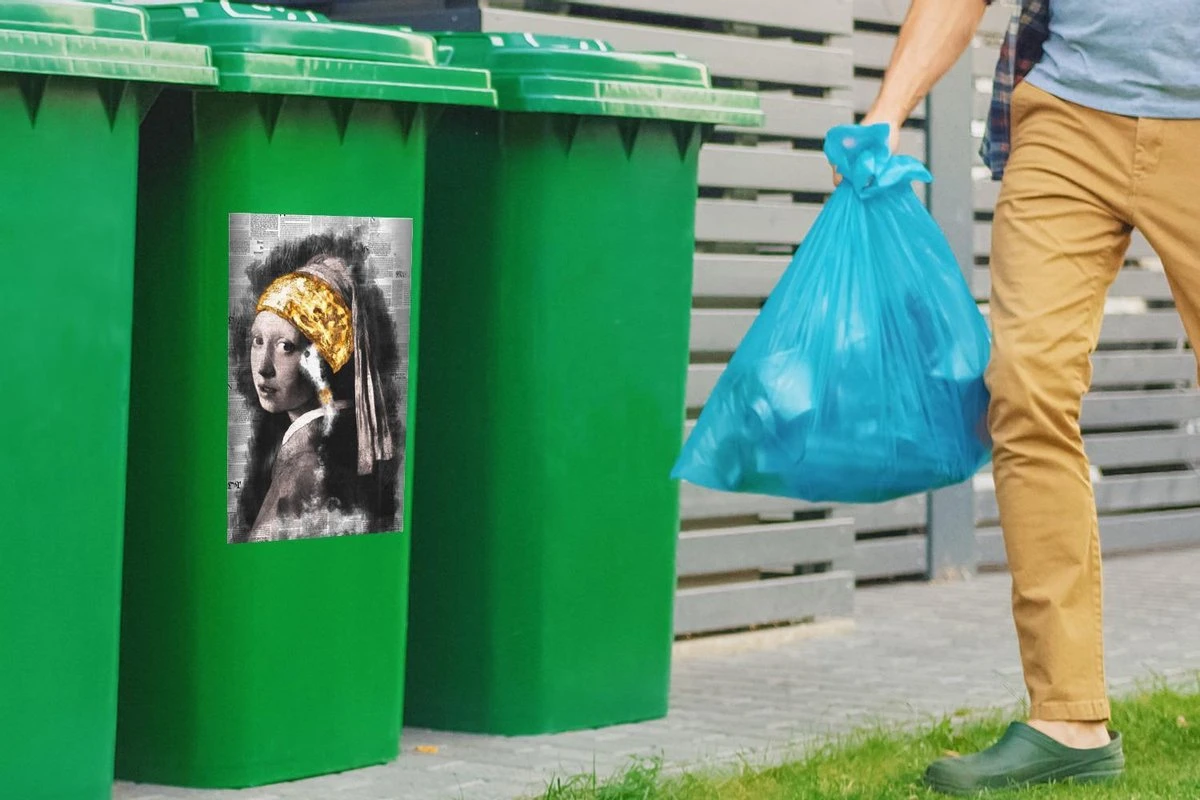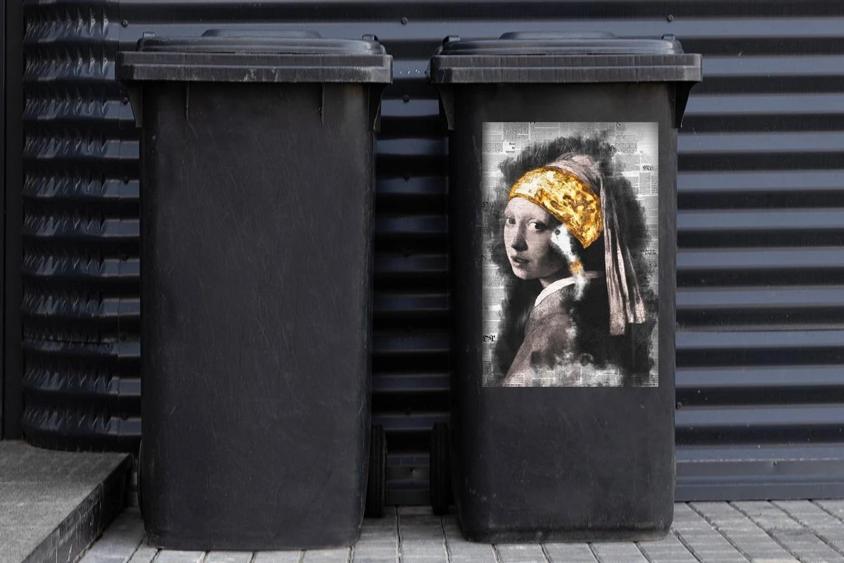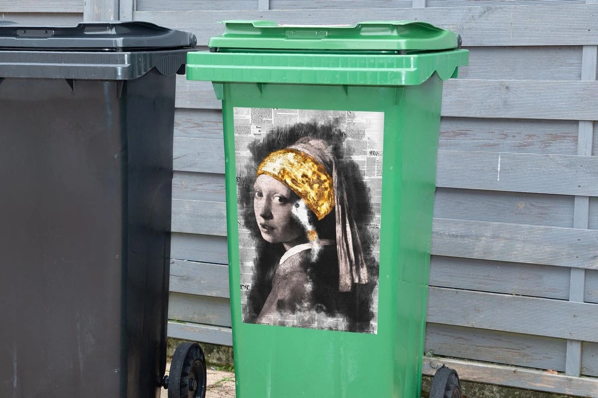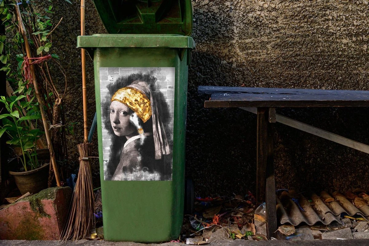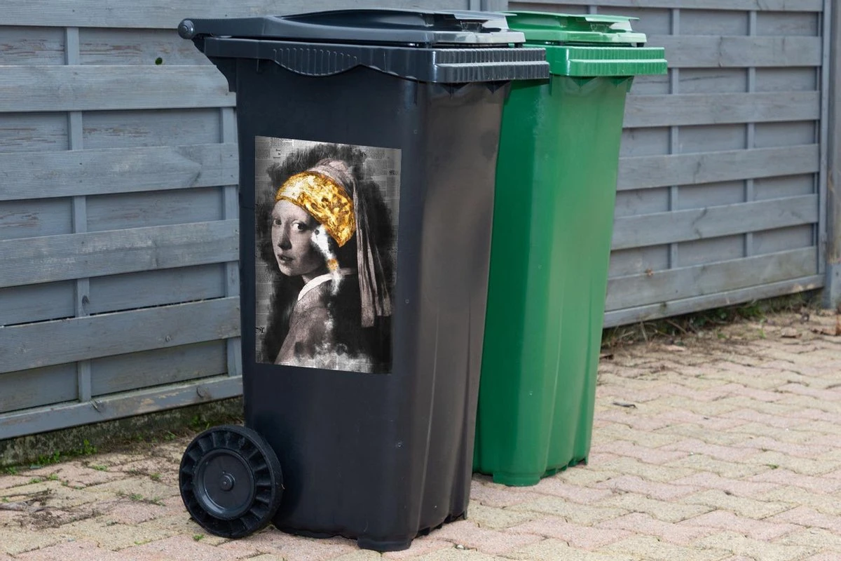 Autocollant De Récipient Maîtres AnciensIllustrations De Noël – Fille Avec Une Boucle D’oreille De Perle Par Le Maître Ancien Johannes Vermeer Sur Un Fond D’imprimé.