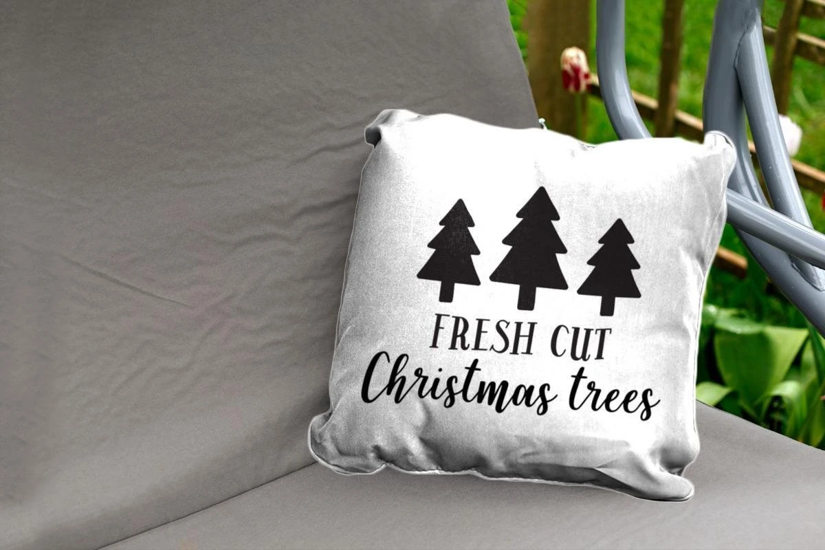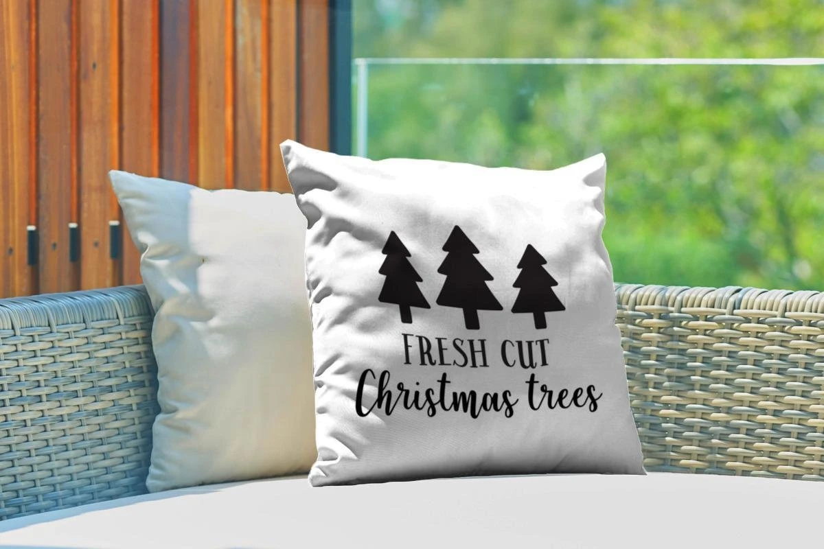 Coussins D’extérieur – Jardin – Citation Arbres De Noël Fraîchement Coupés Sur Fond Blanc – 45×45 Cm