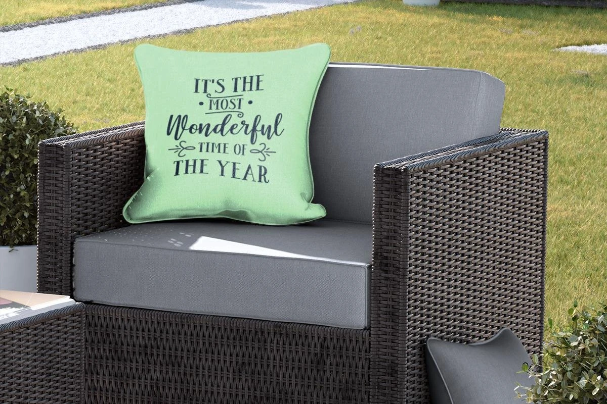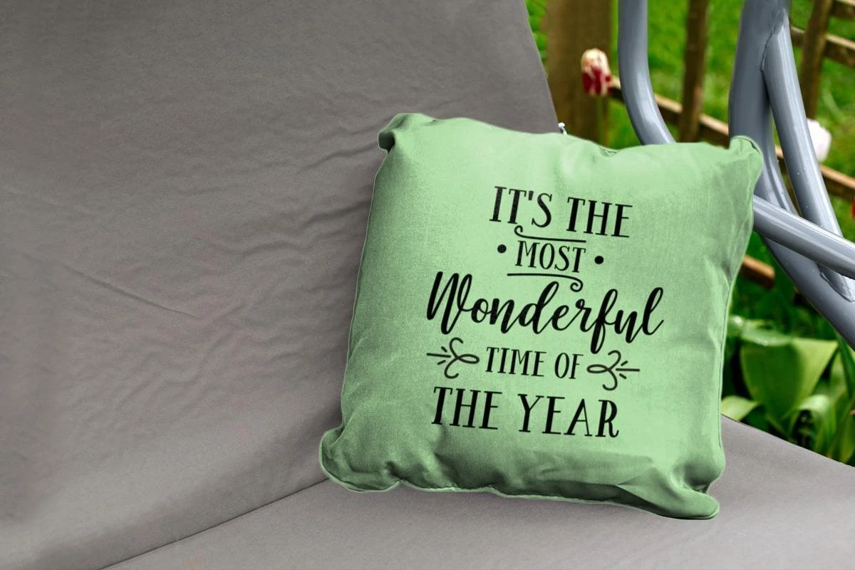 Coussins D’extérieur – Jardin – Citation De Noël C’est La Plus Belle Période De L’année Sur Fond Vert – 45×45 Cm