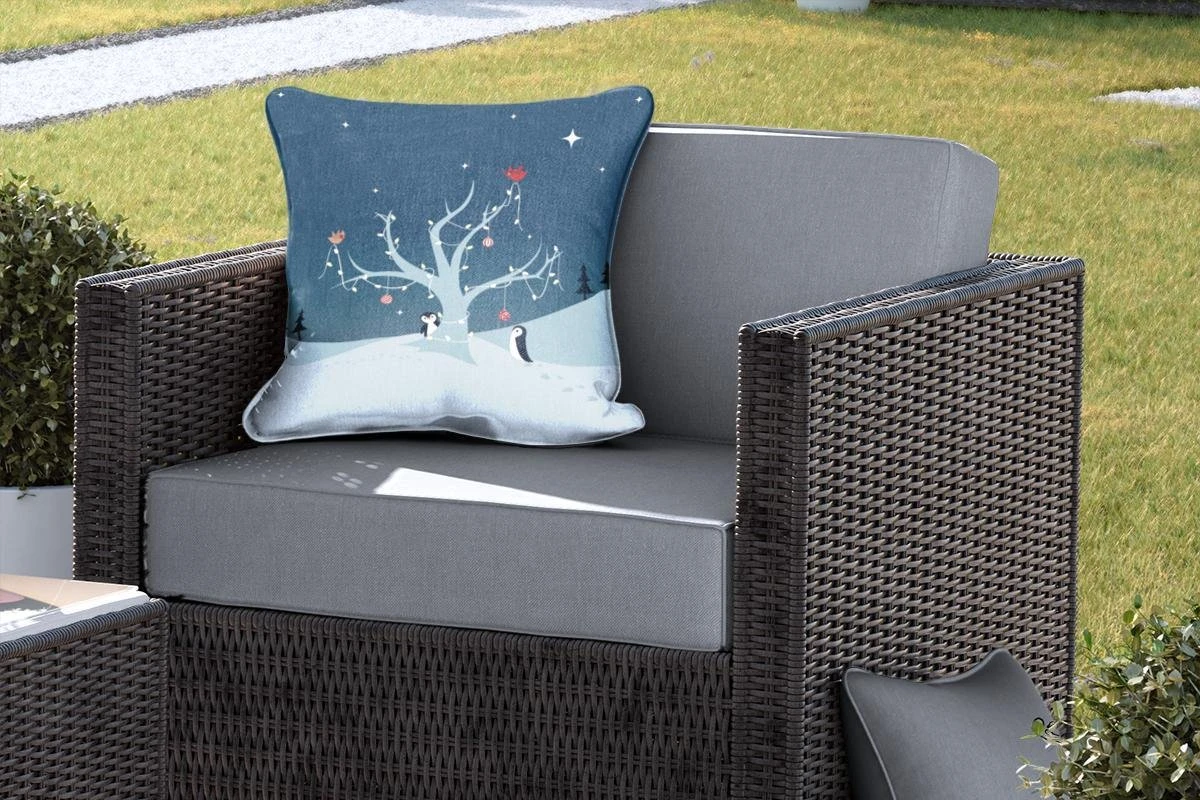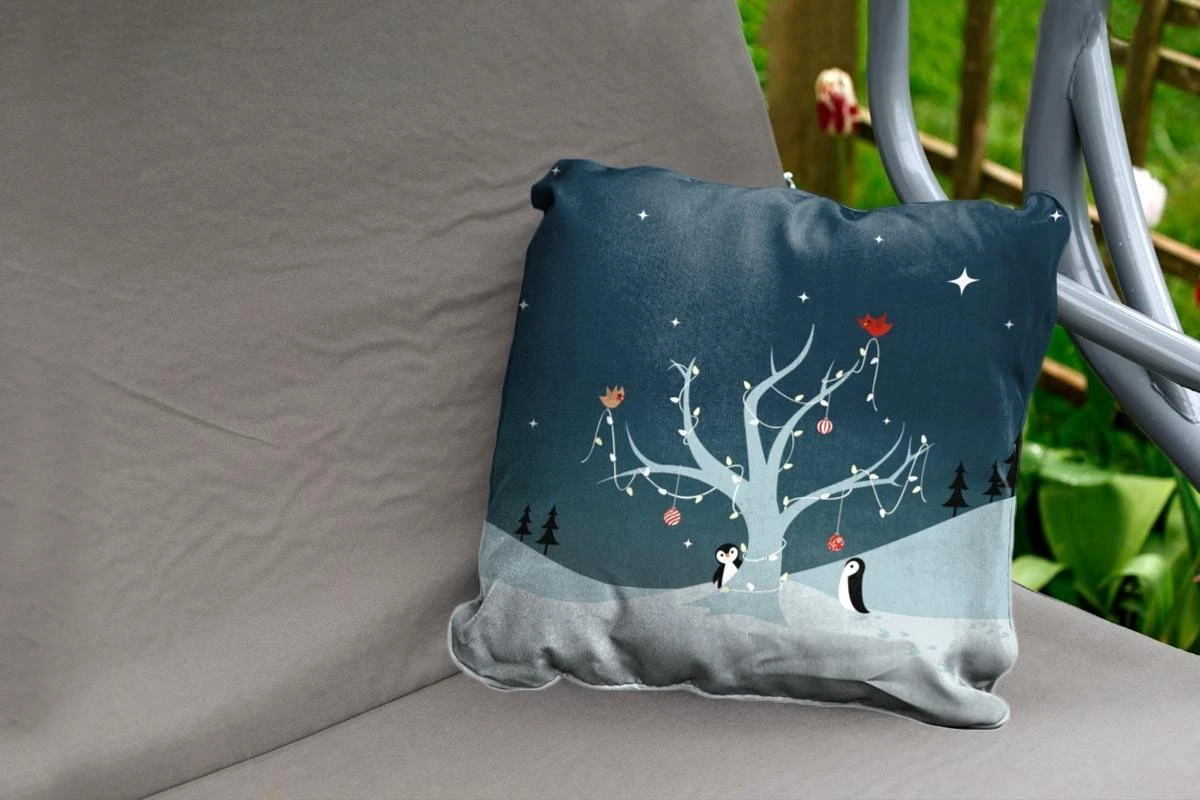 Coussins D’extérieur – Jardin – Illustration De Deux Pingouins Décorant Un Sapin De Noël – 45×45 Cm