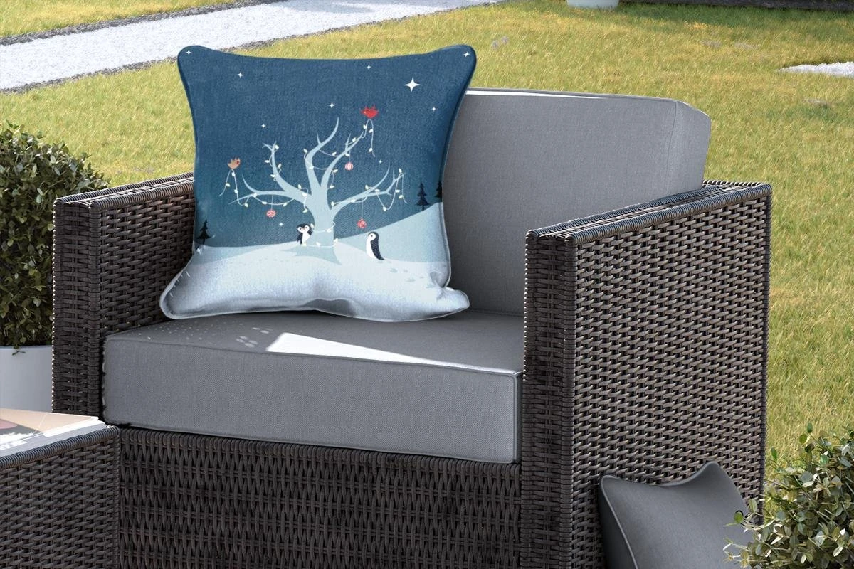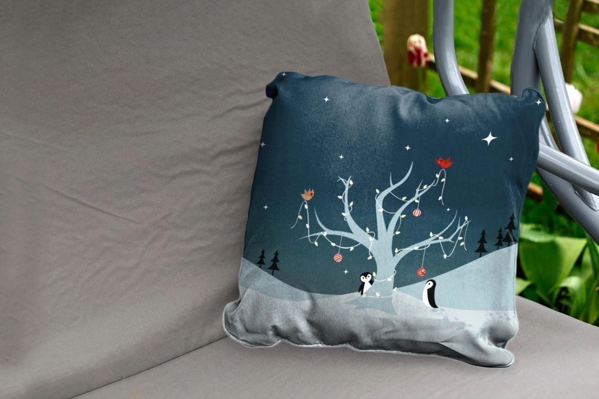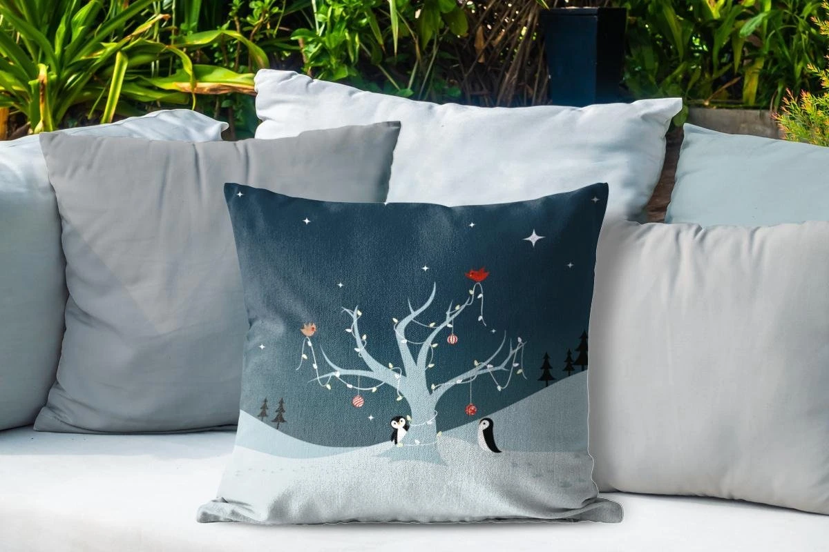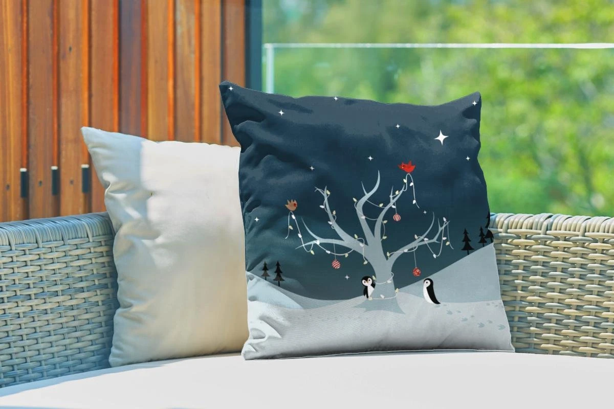 Coussins D’extérieur – Jardin – Illustration De Deux Pingouins Décorant Un Sapin De Noël – 50×50 Cm