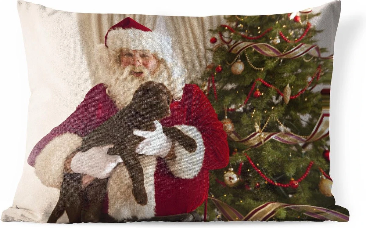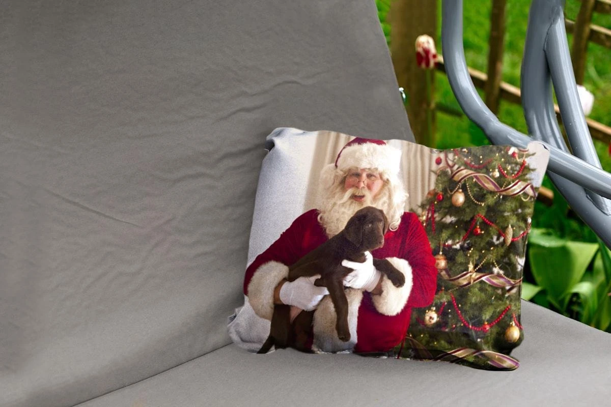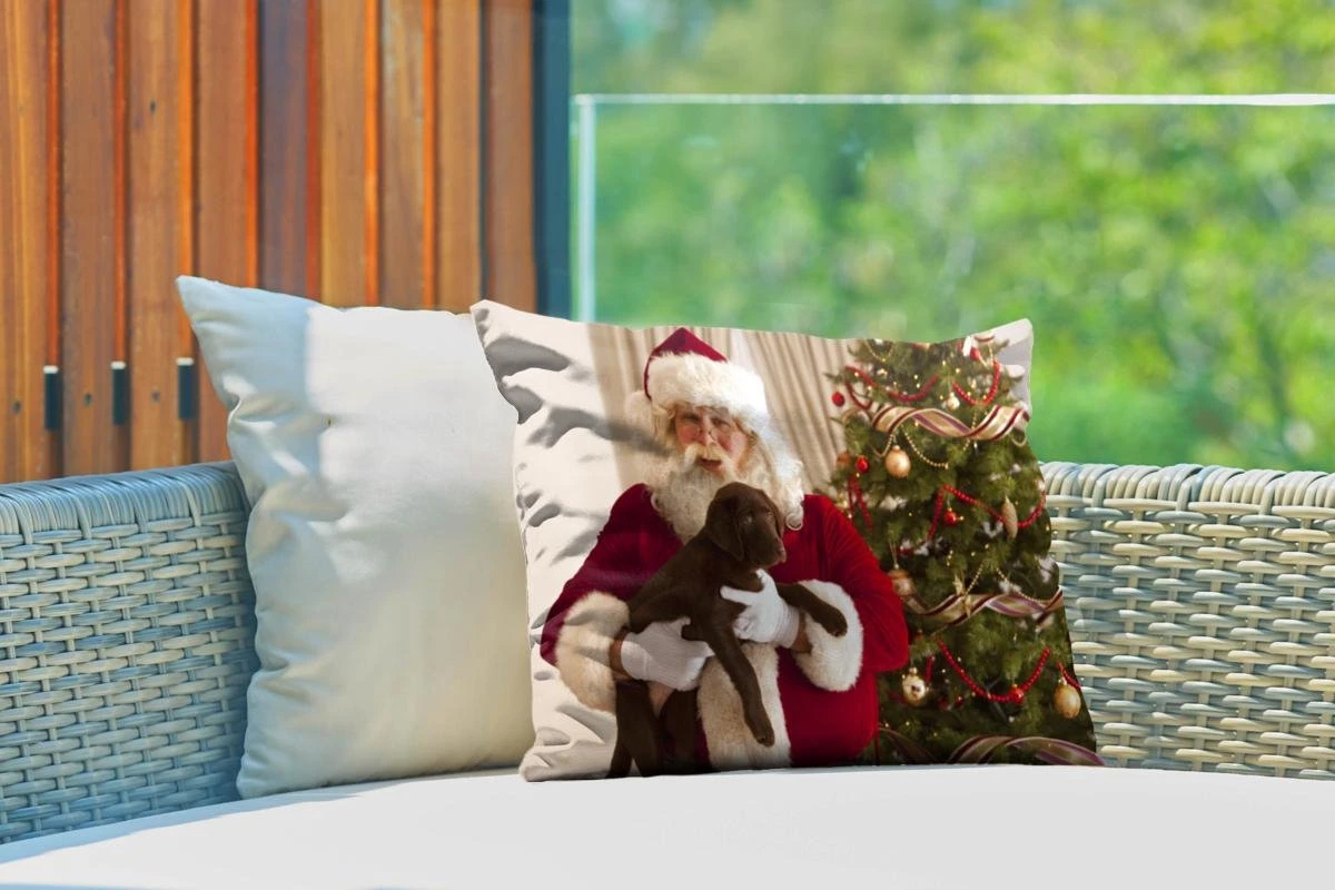 Coussins D’extérieur – Jardin – Père Noël Avec Un Chien Marron Dans Ses Mains – 50×30 Cm