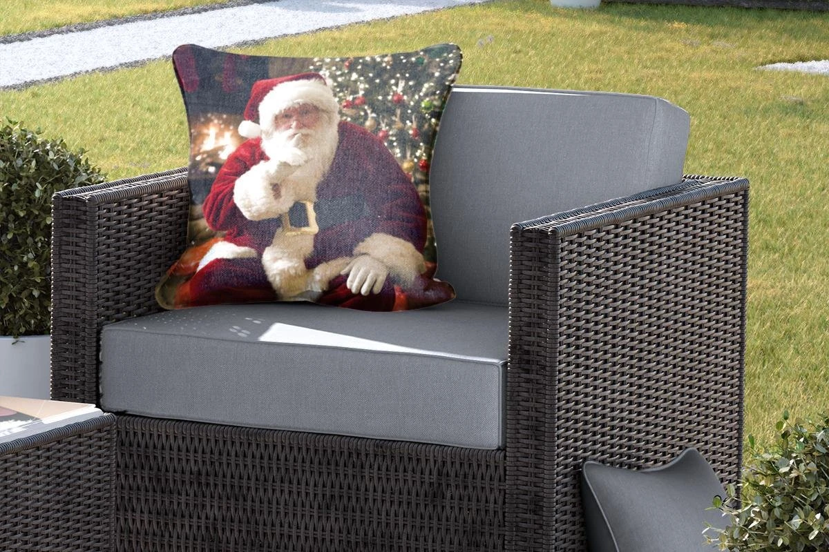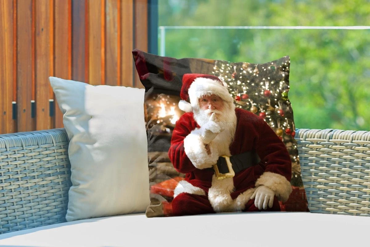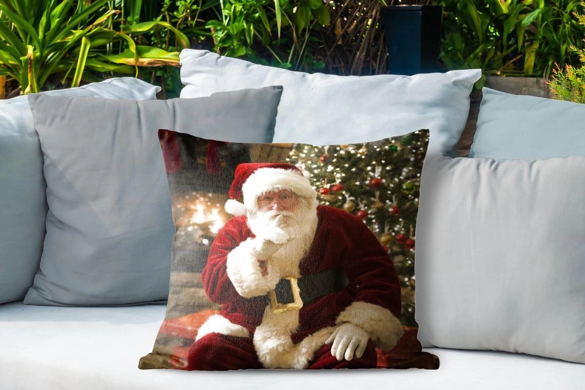 Coussins D’extérieur – Jardin – Père Noël Avec Un Sapin Coloré En Arrière-plan – 50×50 Cm