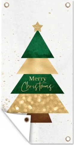 Arbre de Noël avec un pic doré et la citation ‘Joyeux Noël’.