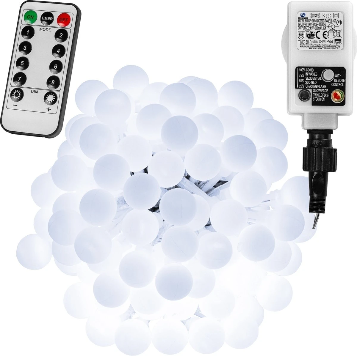 Vous pouvez utiliser la guirlande lumineuse de deux manières, à savoir par la télécommande ou les boutons de l’adaptateur. La guirlande lumineuse dispose de 8 modes d’éclairage différents, notamment : combinaison, onde lumineuse, mode séquentiel, lueur, flash, fondu, scintillement et lumière fixe. Utilisez la fonction de minuterie pratique (automatique 6h allumé / 18h éteint) ou diminuez les réglages de lumière comme vous le wens avec les autres boutons.
