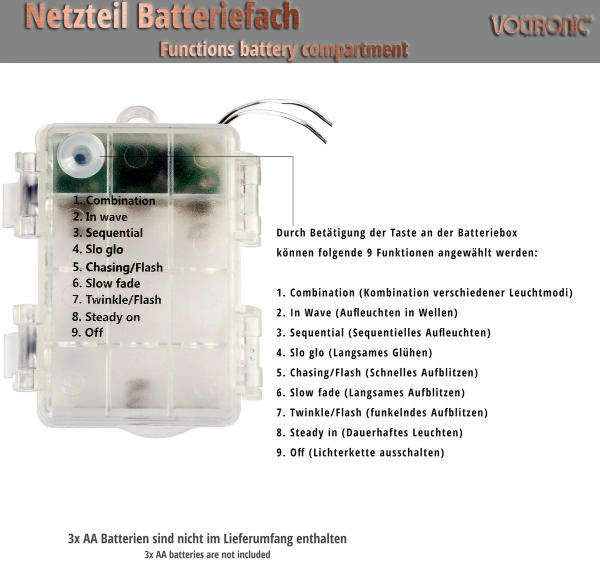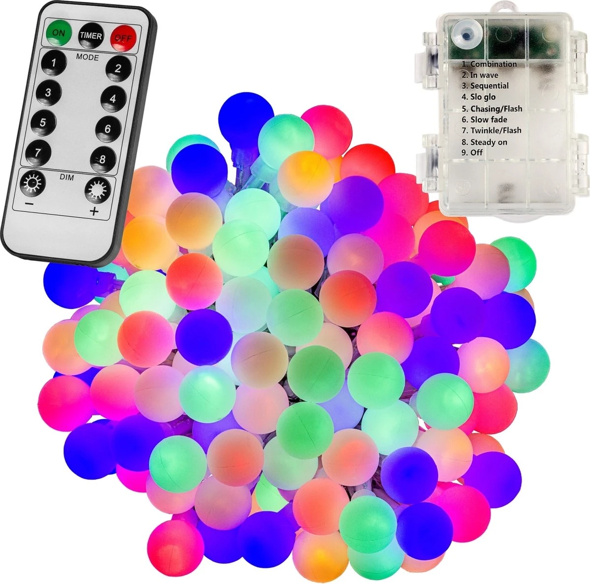 Vous pouvez faire fonctionner la chaîne lumineuse de deux manières, à savoir par la télécommande ou le bouton sur le compartiment à piles (pour basculer entre les modes d’éclairage ou pour éteindre la chaîne). La guirlande lumineuse dispose de 8 modes d’éclairage différents, notamment : combinaison, onde lumineuse, mode séquentiel, lueur, flash, fondu, scintillement et lumière fixe. Avec la télécommande, vous pouvez régler les paramètres d’éclairage avec les boutons 1 à 8, utiliser la fonction de minuterie pratique ou atténuer les paramètres wens.
