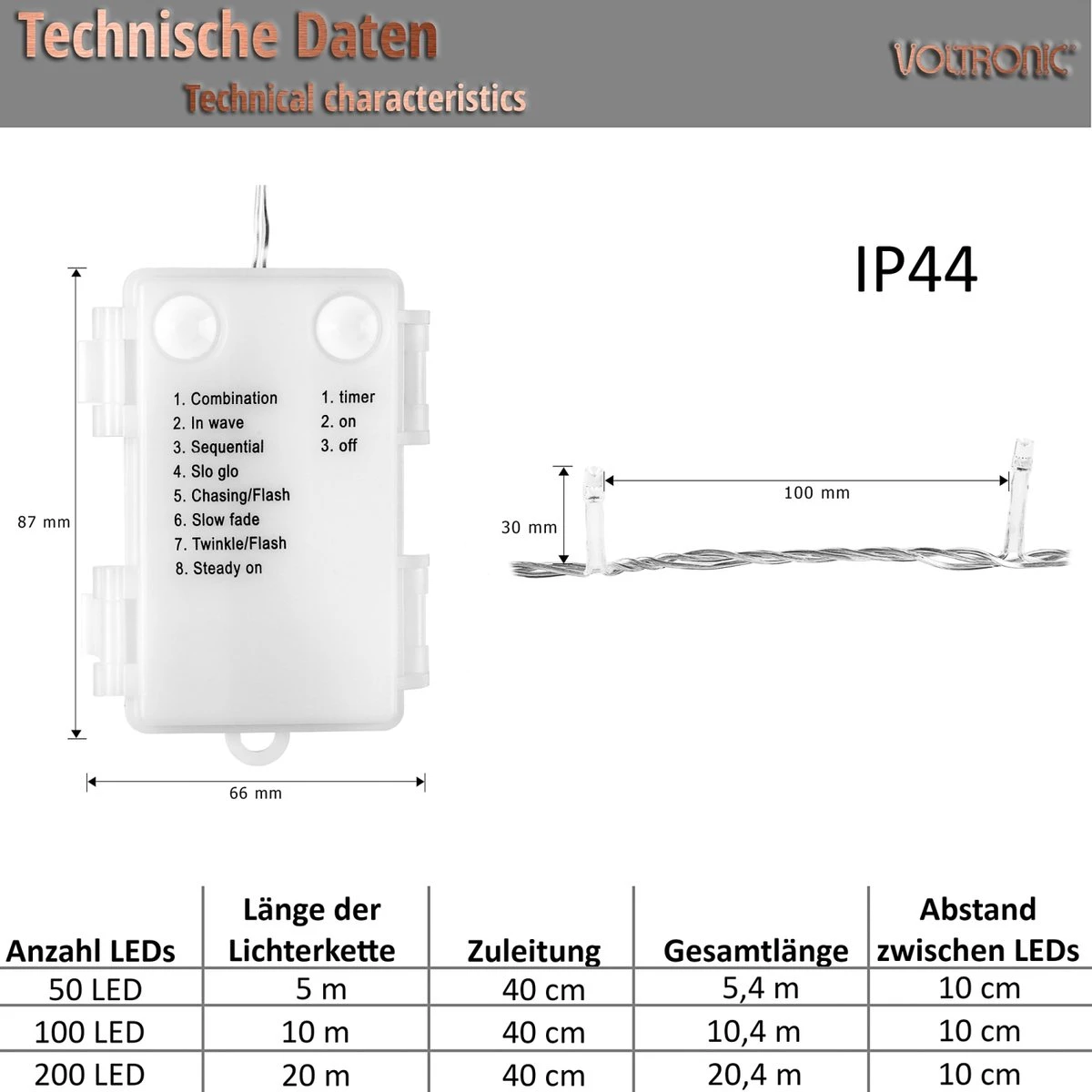 Le compartiment à piles comporte deux boutons faciles à utiliser. Le bouton gauche dispose de 8 modes d’éclairage différents, notamment : combinaison, onde lumineuse, mode séquentiel, lueur, flash, fondu, scintillement et lumière fixe. Avec le bouton droit, vous pouvez allumer et éteindre la guirlande lumineuse ou utiliser la fonction de minuterie pratique (allumage automatique 6 heures / arrêt 18 heures).