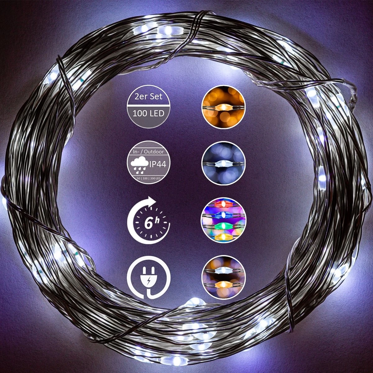 Ces belles chaînes lumineuses (chacune de 10 mètres de long) fournissent une lumière blanche froide et ont chacune 100 LED. Les lumières de Noël conviennent à une utilisation intérieure et extérieure et sont multifonctionnelles. Les gracieuses guirlandes lumineuses sont équipées d’une fonction de minuterie et sont protégées contre les éclaboussures (classe IP44), ce qui les rend parfaites pour une utilisation comme éclairage de balcon, pour la décoration à la maison ou dans le jardin.