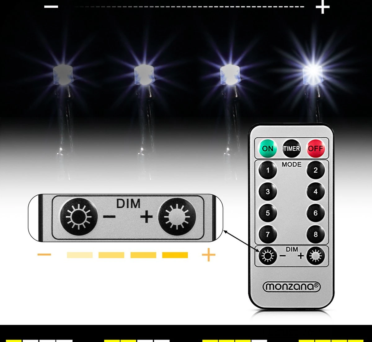 - 8 fonctions d’éclairage peuvent être commandées avec la télécommande ou le compartiment à piles