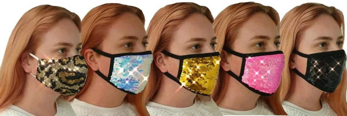 Le masque buccal à paillettes est destiné aux adultes et a des boucles d’oreille élastiques et convient à presque tout le monde.