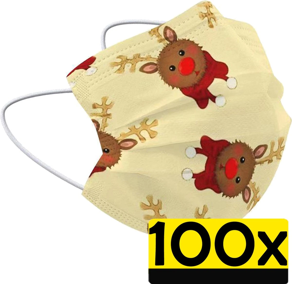 Masque facial de Noël jetable avec imprimé renne (100 pièces), adapté aux espaces publics intérieurs et au dîner de Noël ! (non médical)