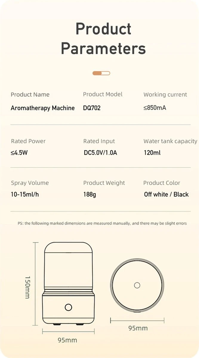 Fonction Aromathérapie : ajoutez de l’eau au réservoir d’eau (ne peut pas dépasser la ligne de niveau d’eau), ajoutez une quantité appropriée d’huile essentielle, appuyez brièvement sur le bouton de l’interrupteur pour démarrer la nébulisation d’aromathérapie ; appuyez à nouveau brièvement pour que l’atomisation fonctionne.